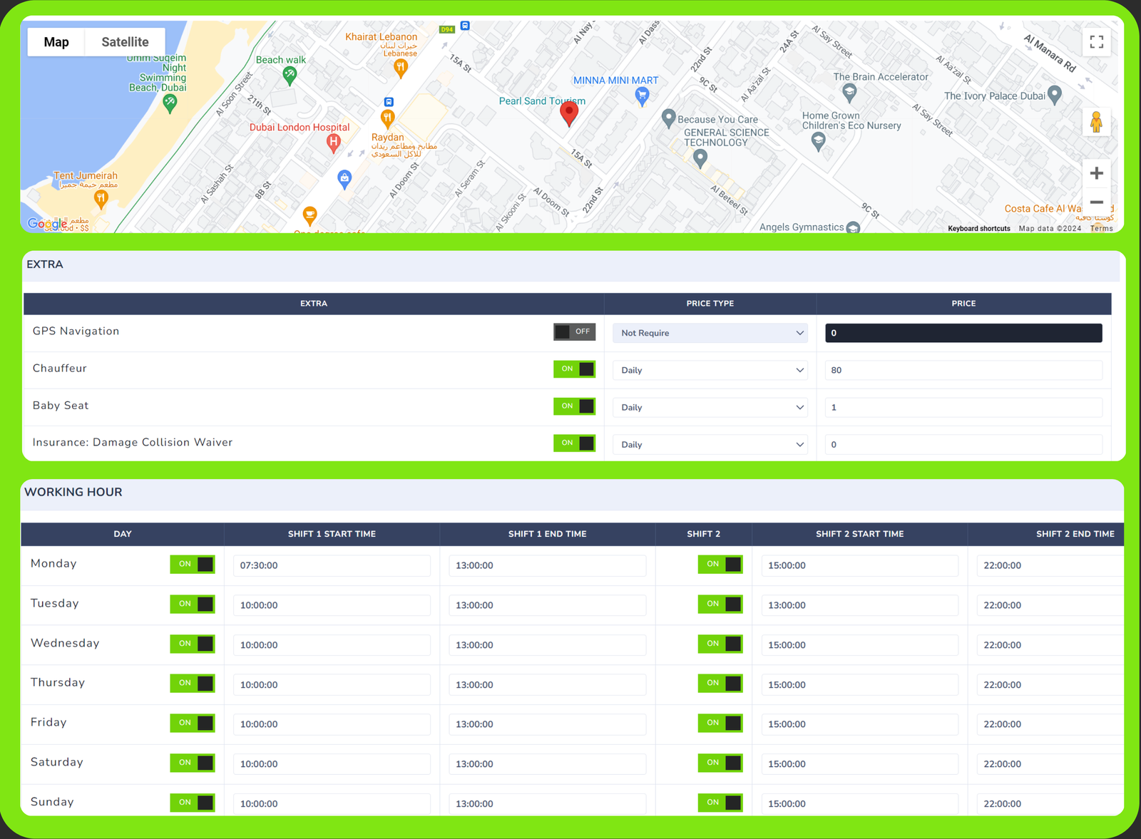 Easily manage offered services and additional extras (car delivery, chauffeurs, item rentals) at each branch.