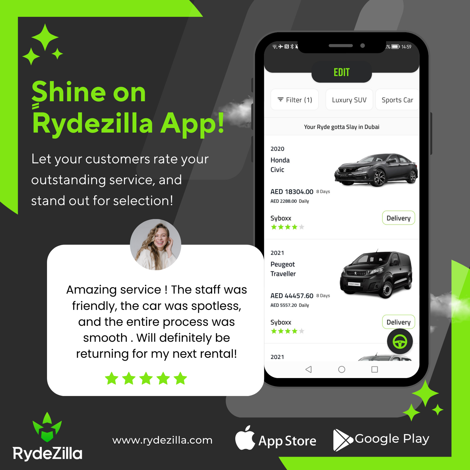 Display your customer ratings prominently within the User App. Encourage positive reviews and build a strong reputation to attract more renters.